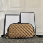 Adjustable chain shoulder strap with 23.5″ drop. Can also be worn as a crossbody bag.